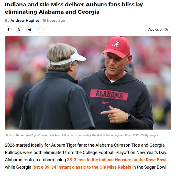 phughes+FollowAuburn fans celebrate as rivals fall on New Year's DayNothing feels better for Auburn fans than seeing both Alabama and Georgia knocked out of the College Football Playoff on New Year's Day. Indiana stunned Alabama with a 38-3 blowout in the Rose Bowl, while Ole Miss edged Georgia in a wild Sugar Bowl finish. Watching the Tide get outplayed was especially sweet, and now, with new faces like Trinidad Chambliss and Fernando Mendoza making waves, it feels like the CFP is wide open for fresh champions. Could Auburn follow the same path and shake up the playoff picture next? Let’s hear your thoughts on the new era of college football! #Sports #Football #Auburn00Share