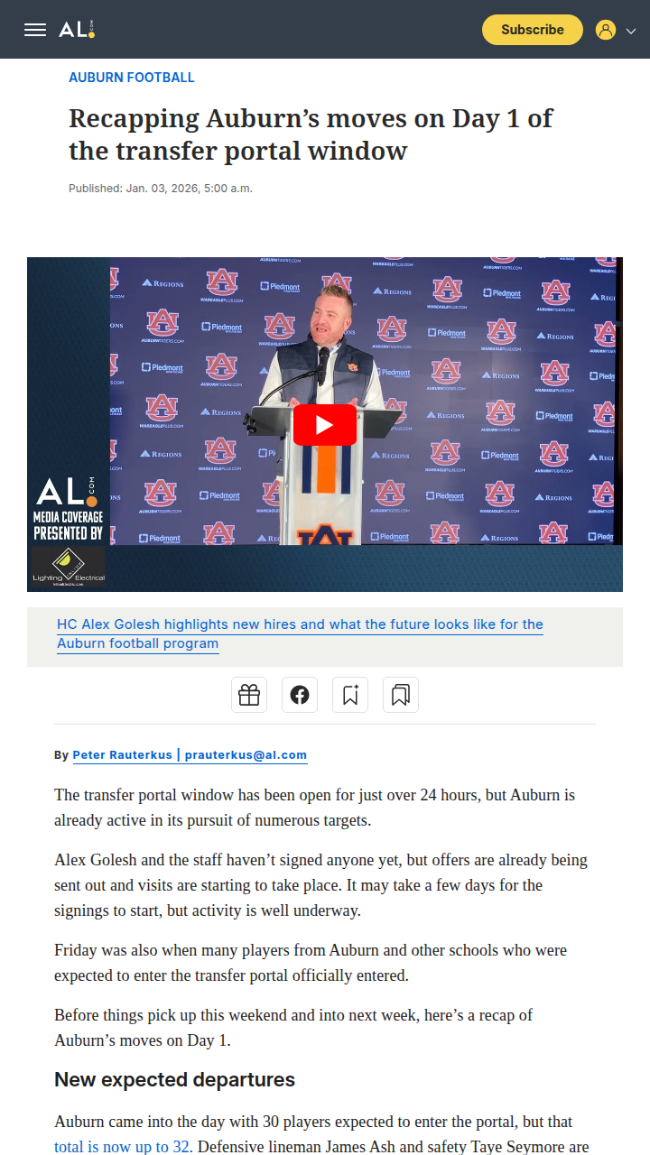 glen25+FollowAuburn’s transfer portal shakeup: Who’s in, who’s out?Auburn fans, the transfer portal just opened and things are already heating up. Two more Tigers—James Ash and Taye Seymore—are expected to leave, bumping the total to 32. Meanwhile, the coaching staff is hustling, lining up visits from top prospects like Grant Seagren and Bryce Anderson. On the bright side, three promising freshmen defensive backs, including the duo of Eric Winters and AnQuon Fegans, have confirmed they’re staying. With big names like Cam Coleman exploring SEC rivals, the next few days could reshape Auburn’s roster. How do you feel about these early moves? #Sports #Football #Auburn00Share