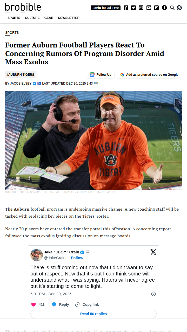 Chad Williams+FollowAuburn football faces major shakeupNearly 30 Auburn football players have hit the transfer portal, and the buzz around the program is louder than ever. With a new coaching staff led by Alex Golesh stepping in after Hugh Freeze’s turbulent tenure, big changes are coming fast. Star receiver Cam Coleman is just the latest to leave, and rumors of locker room drama and contract disputes are swirling. Former players are weighing in, some backing the new staff’s tough approach. Auburn fans, how do you feel about this massive overhaul? Is this the reset the Tigers need, or is the program in trouble? #Sports #Football #AuburnFootball00Share