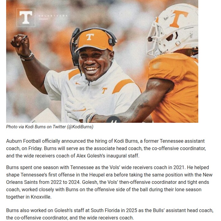 Michael Pitts+FollowAuburn brings back Kodi Burns to lead offenseAuburn fans, big news—Kodi Burns is officially returning to his alma mater as associate head coach, co-offensive coordinator, and wide receivers coach. Burns, who played a key role in Auburn’s 2010 national championship, has built an impressive coaching resume at Tennessee, South Florida, and even the New Orleans Saints. Now, he’s teaming up again with Alex Golesh to energize Auburn’s offense. With Burns’ reputation as a top recruiter and offensive mind, expectations are sky-high. How do you think his return will impact Auburn’s future? Let’s hear your thoughts! #Sports #Football #AuburnFootball00Share