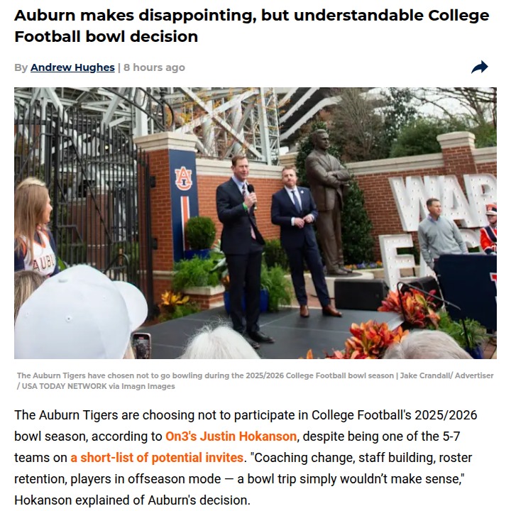 Jeffrey Armstrong+FollowAuburn fans left out as Tigers skip bowl seasonAuburn’s football program is hitting pause on bowl games this year, even though they were eligible for a spot. With a new head coach, Alex Golesh, focused on rebuilding the staff and keeping key players, the decision is all about the long-term future—not a quick postseason trip. For fans, it’s a tough pill to swallow, especially since a local bowl game was possible and the team hasn’t had much postseason action lately. Do you think Auburn made the right call, or should they have played one more for the fans? #Sports #Football #AuburnFootball00Share