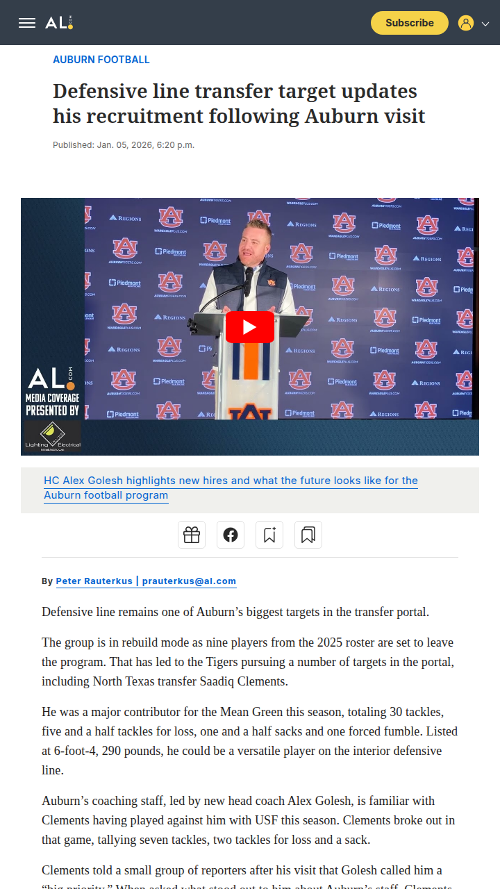 phughes+FollowAuburn’s D-line rebuild: Saadiq Clements in the mixAuburn’s defensive line is about to look very different, with nine players leaving after this season. The Tigers are eyeing North Texas standout Saadiq Clements, who made a big impression on Auburn’s new coaching staff during his visit. Clements, a force at 6’4”, 290 lbs, is being told he’s a top priority and could be a game-changer in the SEC. But there’s a twist—Oklahoma State is also in the running, thanks to a coaching connection. With the transfer portal open until Jan. 16, Auburn fans, how do you feel about this high-stakes recruiting battle? #Sports #Football #AuburnFootball00Share
