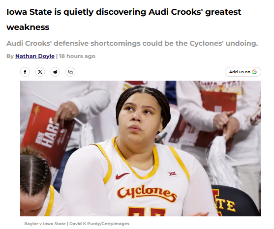 AmberAbyss+FollowIs Iowa State’s Audi Crooks hurting the Cyclones?Audi Crooks has been a scoring machine for Iowa State, but her defensive struggles are starting to cost the Cyclones big time. After a red-hot 14-0 start, the team has now dropped five straight, with opponents targeting Crooks’ lack of mobility and stamina. While her size makes her nearly unstoppable in the post, it’s become a liability on defense, especially in fast-paced games. Fans are split: can Crooks develop her defense and keep her WNBA dreams alive, or will this weakness hold her—and Iowa State—back? Let’s hear your take! #Sports #IowaState #AudiCrooks01Share