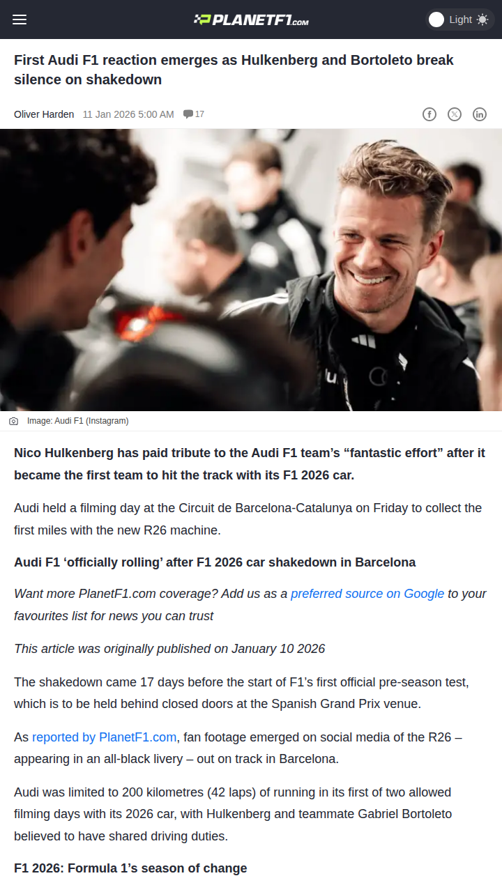 qglover+FollowAudi F1’s R26: The Rings Hit the Track!Big news from Barcelona! Audi F1 just made history as the first team to run its 2026 car, the R26, with Nico “The Hulk” Hulkenberg and rising star Bortoleto behind the wheel. The all-black beast turned heads during its shakedown, and both drivers praised the team’s rapid progress. Could this be the start of a new rivalry on the grid? Let’s hear your thoughts, F1 fans! #Sports #Racing #AudiF110Share