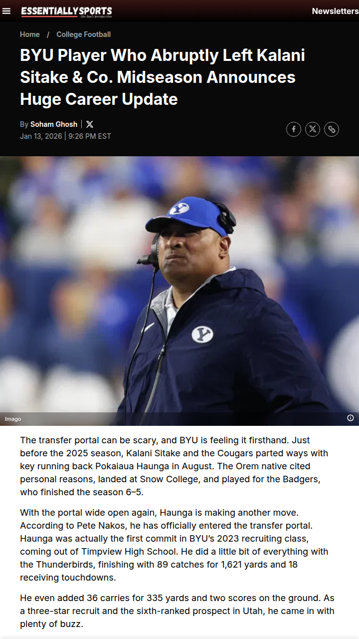 Christopher Hughes+FollowBYU’s Haunga shakes up transfer portal againPokaiaua Haunga, once BYU’s highly touted recruit and a local standout from Orem, is back in the transfer portal after a season at Snow College. Haunga’s journey has been anything but predictable—he left BYU midseason, citing personal reasons, then made an impact at Snow. Now, with his proven skills and FBS experience, he’s a hot commodity for programs needing a versatile playmaker. This move leaves BYU fans wondering how the Cougars will fill the gap, but early signs show the 2026 recruiting class is holding strong. Where do you think Haunga lands next, and how will BYU adapt? #Sports #Football #BYUFootball00Share