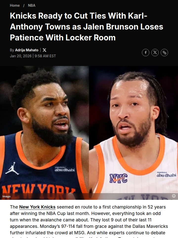 Brian Gaines+FollowKnicks locker room tension boils over at MSGJalen Brunson’s frustration was on full display after the Knicks’ latest home loss, echoing the disappointment of fans who paid top dollar to watch their team struggle. With the team dropping 9 of their last 11 games, all eyes are now on Karl-Anthony Towns, whose recent performances have sparked trade rumors. The front office is reportedly exploring options, but isn’t rushing into a deal—unless a superstar like Giannis is involved. Knicks fans, what’s your take: is it time for a major shakeup, or should the team stay patient and ride out the storm? #Sports #Basketball #Knicks11Share