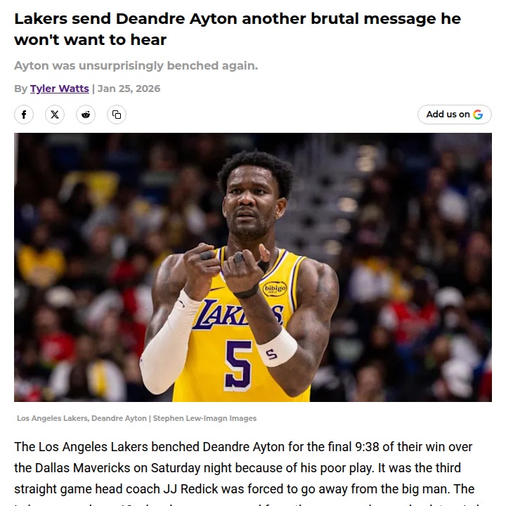 Amy Tanner+FollowAyton Benched Again: Lakers Send a MessageLakers fans, what’s your take on Deandre Ayton riding the pine for the last 9+ minutes against Dallas? That’s three straight games Coach Redick has benched the big man, and LA pulled off another comeback without him. Ayton’s stats look okay, but his 4-for-16 shooting and minus-27 over three games tell the real story. If he doesn’t step up, is his starting spot in real jeopardy? Let’s hear your thoughts on this Ayton-Lakers saga! #Sports #Basketball #LakeShow10Share
