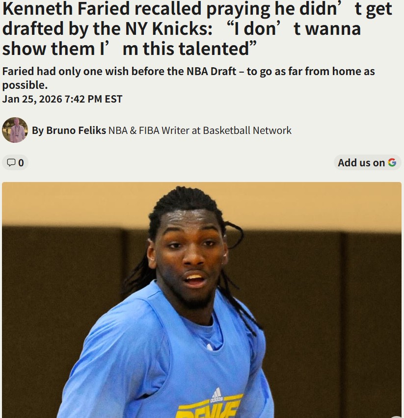 Susan Reeves+FollowFaried Dodges Knicks: What If Manimal Came Home?Manimal fans, did you catch Kenneth Faried’s recent Knicks draft night confession? The New Jersey native admitted he actually prayed NOT to be picked by his hometown Knicks, fearing the MSG spotlight and pressure could crush a young player. Imagine the rivalry if Faried had brought his energy to the Garden! Instead, he became a Denver highlight machine. Do you think the Knicks missed out, or did Faried make the right call? #Sports #Basketball #Knicks00Share