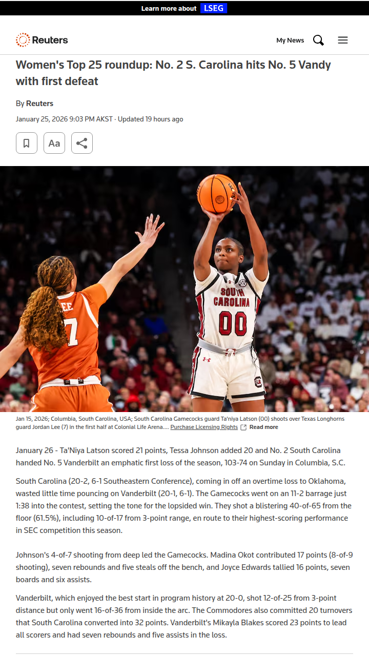 Brian Gaines+FollowGamecocks Snap Vandy’s Perfect Run!Wow, what a statement from Dawn Staley’s Gamecocks! After a tough OT loss, South Carolina bounced back and handed the previously unbeaten Commodores their first L of the season in dominant fashion. Ta’Niya Latson and Tessa Johnson were on fire, but it was the Gamecocks’ 11-2 opening run that really set the tone. Vandy’s dream start is over—how do you see this rivalry shaping up for the SEC tourney? #Sports #Basketball #Gamecocks10Share