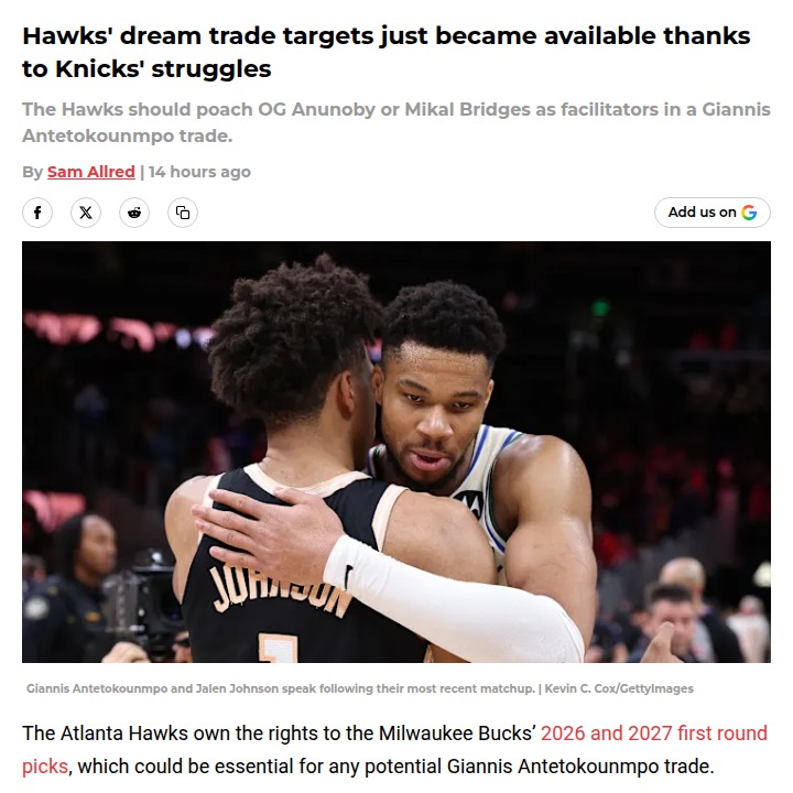Theresa Boyd+FollowHawks Eye Bridges or OG as Knicks, Bucks FlounderWith the Knicks in a tailspin and the Bucks facing uncertainty around the Greek Freak, Atlanta’s front office is quietly positioned to swoop in. The Hawks hold key Milwaukee picks that could unlock a blockbuster, and with Mikal Bridges and OG Anunoby potentially up for grabs, GM Onsi Saleh has a golden chance to bolster the squad. If Atlanta plays this right, they could steal a top-tier forward while helping desperate rivals. What do you think—should the Hawks go all-in for Bridges or OG? #Sports #Basketball #TrueToAtlanta00Share