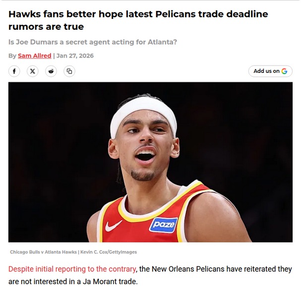 guerrajohn+FollowWhy Hawks fans are rooting for Pelicans lossesEvery time the Pelicans lose, it’s actually a win for Atlanta Hawks fans. Here’s why: the Hawks own New Orleans’ 2026 first-round pick, and with the Pelicans stuck at the bottom of the West, that pick could turn into a franchise-changing star. Despite rumors, the Pelicans aren’t trading for Ja Morant, so their struggles are likely to continue. If you’re a Hawks fan, you might be following New Orleans’ record more closely than Atlanta’s! What do you think—should the Hawks keep banking on draft luck, or try a different rebuild strategy? #Sports #Basketball #Hawks00Share