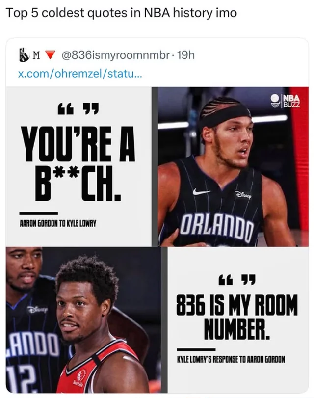 Nicole Hernandez+FollowKyle Lowry Stood On BusinessNo threats. No speeches. Just directions. #NBA #KyleLowry #AaronGordon #Memes #BasketballTalk 10Share