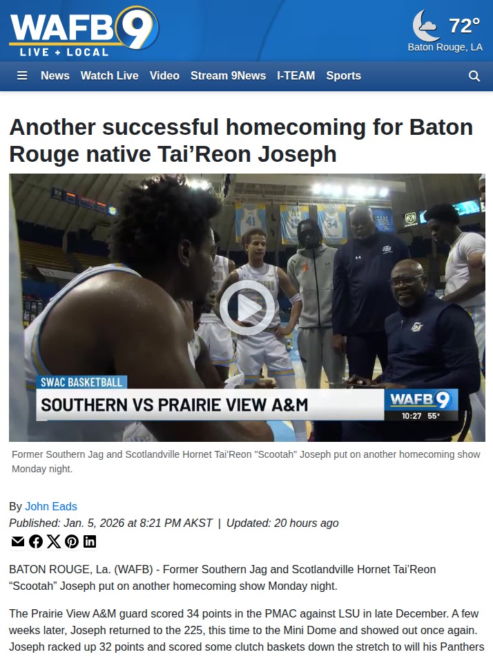 Amy Tanner+FollowTai’Reon Joseph lights up Baton Rouge againTai’Reon “Scootah” Joseph just can’t stop putting on a show when he’s back in Baton Rouge. The former Scotlandville Hornet and Southern Jag dropped 32 points at the Mini Dome, leading Prairie View A&M to a tight 89-85 win over his old team. It’s wild to see a hometown player come back and deliver clutch baskets against familiar faces—especially after scoring 34 against LSU just weeks ago. Baton Rouge hoops fans, how do you feel watching a local star shine, even when he’s playing for the other side? #Sports #Basketball #BatonRouge00Share