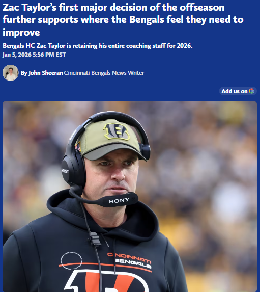 Jay Williams+FollowBengals double down on roster shakeupCincinnati is sticking with Zac Taylor and his entire coaching staff for 2026, signaling that the real changes are coming for the Bengals’ roster—not the sidelines. After last year’s staff overhaul, this offseason is all about finding new talent, especially on defense, to turn things around after a tough 6-11 season. Even Joe Burrow is pushing for aggressive moves in free agency. If the Bengals want a different outcome, it’s clear: the locker room needs fresh faces. What positions do you think should be the top priority for upgrades? #Sports #Football #Bengals11Share