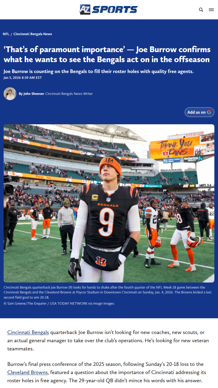 Amy Williams+FollowJoe Burrow’s offseason message to Bengals fansJoe Burrow isn’t holding back—he wants the Bengals to get aggressive in free agency and fix the roster holes that kept them from a deeper playoff run. He’s not asking for new coaches or a front office shakeup, just more proven veterans to help Cincinnati compete for championships every year. Burrow’s been clear: it’s time to get creative and make real changes, not just rely on the draft. Bengals fans, what positions do you think need the biggest upgrades? And who would you love to see in orange and black next season? #Sports #Football #Bengals01Share