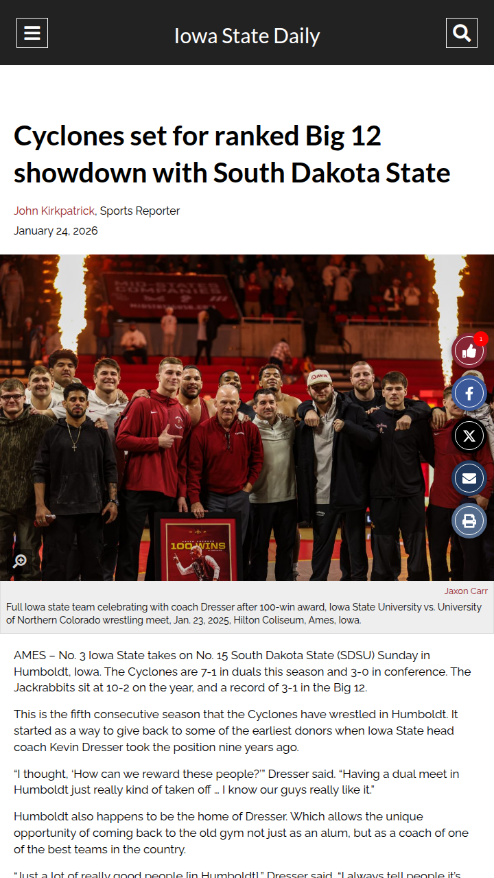 Bruce Johnson+FollowBig 12 wrestling showdown hits HumboldtTop-ranked Iowa State and South Dakota State are bringing some serious wrestling firepower to Humboldt this weekend. With nearly every starter on both teams nationally ranked, fans can expect intense matchups—especially at 197 pounds, where ISU’s Rocky Elam (undefeated this season) faces SDSU’s Bennett Berge. This isn’t just another dual: it’s a homecoming for ISU coach Kevin Dresser, who’s turned this annual Humboldt event into a local tradition. Which matchups are you most excited to see? Who do you think will come out on top? Let’s hear your predictions! #Sports #Wrestling #Big1200Share