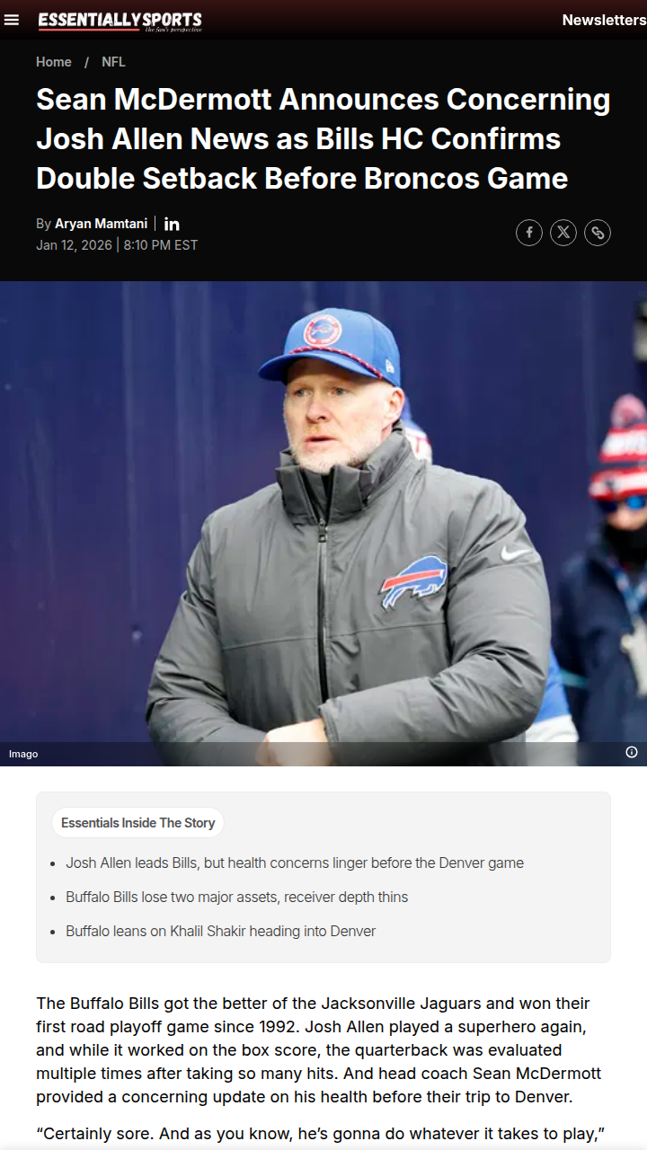Chad Williams+FollowBills vs Broncos: Can Superman Allen Strike Again?Bo Nix is showing a ton of respect for Josh Allen ahead of the Bills vs Broncos divisional clash, calling him a generational talent and the league’s MVP for a reason. After Buffalo knocked Denver out last year, this rematch is personal. Allen’s been playing through injuries and still pulling off superhero moments—can he do it again in Denver, or will Nix and the No. 1 seed Broncos flip the script? Saturday’s showdown is set to be epic! #Sports #Football #BillsMafia00Share