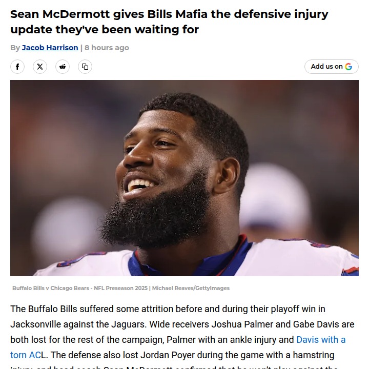 phughes+FollowBills face double injury blow before Broncos clashJosh Allen’s gutsy playoff heroics came at a price—he’s banged up with a sore finger, a tweaked ankle, and a nagging foot injury, but he’s pushing through. The bigger concern for Buffalo fans? The receiver room is suddenly razor-thin. Gabe Davis is out for the season with a torn ACL, Tyrell Shavers is being evaluated for a knee issue, and Josh Palmer is already on IR. With the Broncos’ red zone defense looming, can Shakir, Coleman, and Cooks step up? How worried are you about the Bills’ offense heading into Denver? #Sports #Football #BillsMafia24Share