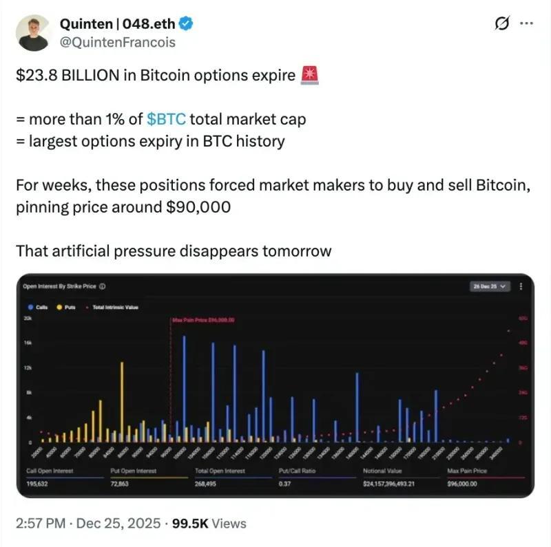 Gregory Mann+FollowBitcoin's About to Make a Move—Are You Ready?Bitcoin’s been stuck in a $85K-$90K rut all December, but that could change soon as a massive batch of options contracts is about to expire. Think of it like a tug-of-war between buyers and sellers that’s kept prices steady. Once those contracts are gone, the rope might snap—and prices could jump toward $96K or higher. If you’re watching crypto, now’s the time to pay attention! #Business #Market #Bitcoin00Share