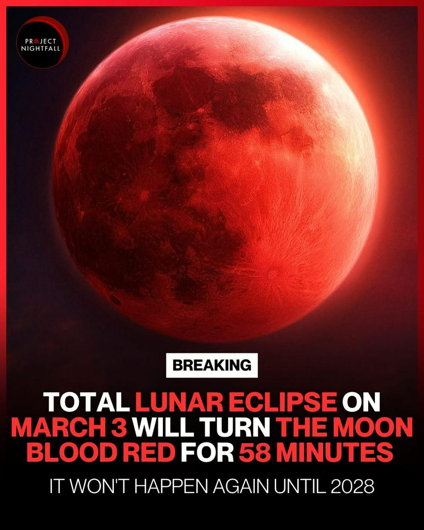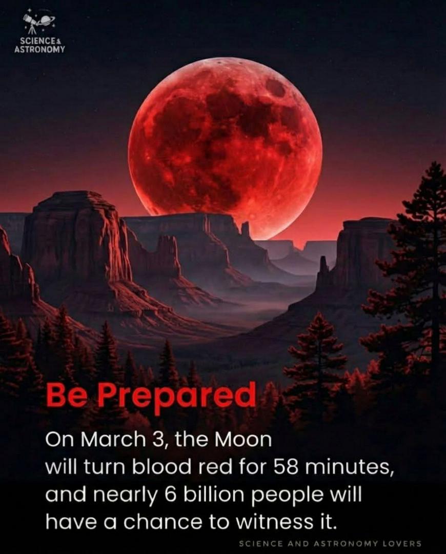 Total Lunar Eclipse — March 3, 2026 | Blood Moon 🌙 On March 3, 2026, the Moon will slip completely into Earth’s darkest shadow and reappear bathed in deep crimson and copper hues. This unforgettable “Blood Moon” occurs when sunlight passes through Earth’s atmosphere, filtering out blue light and allowing warm red tones to wash across the lunar surface. The result is dramatic, rare, and breathtaking. ⏰ Eclipse Timeline (UTC) • Penumbral eclipse begins: 08:44 • Partial eclipse begins: 09:50 • Total eclipse begins: 11:04 • Maximum eclipse: 11:33 • Total eclipse ends: 12:02 • Partial eclipse ends: 13:17 • Penumbral eclipse ends: 14:22 The Moon will remain fully immersed in Earth’s umbra for nearly 58 minutes, while the deepest red shades may be visible for up to 82 minutes during the peak stages. 🌍 Why This Eclipse Stands Out ✨ Earth’s atmosphere scatters shorter blue wavelengths, letting red light reach the Moon ✨ Dust, clouds, and air conditions influence the exact shade — each eclipse looks different ✨ Visible across large parts of the world, making it one of 2026’s most widely observed sky events 🔭 How to Watch No special equipment is required — it’s completely safe to view with the naked eye. Binoculars or a telescope will enhance the experience, revealing delicate color variations and lunar surface detail. A calm yet powerful alignment of the Sun, Earth, and Moon will unfold slowly overhead. When the night sky stages something this extraordinary, it’s worth stepping outside to witness it. #BloodMoon #BloodMoon2026