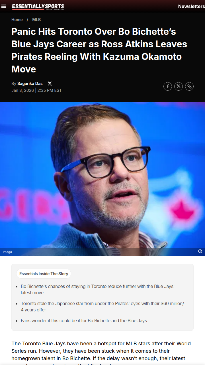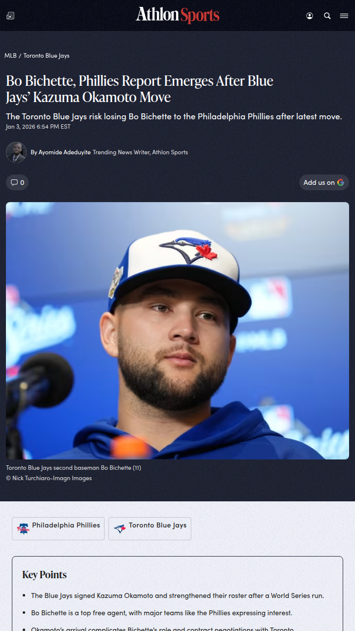 Cassandra Reed+FollowBo Bichette’s Future in Doubt After Okamoto SigningBlue Jays fans, what’s your take on the front office’s latest power move? Toronto just swiped Kazuma Okamoto from under the Pirates’ noses, and while his bat and versatility are huge, the real buzz is about Bo Bichette. With Okamoto set for third, could Bo’s days as the Jays’ franchise shortstop be numbered? Is this the start of a new era or just smart roster depth? Let’s hear your thoughts! #Sports #Baseball #BlueJays00Share