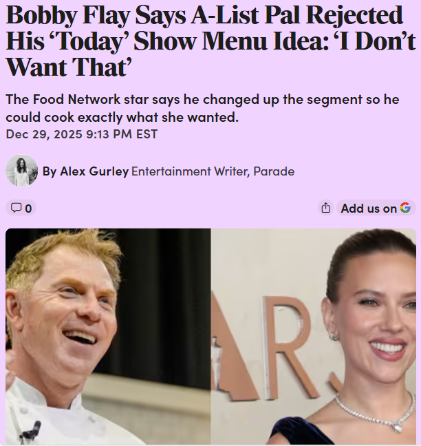Jennifer ArnoldFollowingScarlett Johansson Shuts Down Bobby Flay's Menu 😲Bobby Flay spilled on his podcast that Scarlett Johansson totally vetoed his original 'Today' show menu idea! She texted him before the taping and flat-out said she didn’t want his holiday pork chop, making him switch to hors d’oeuvres instead. Fans are split—was Scarlett being a diva or just a foodie with high standards? This twist has everyone debating who really runs the kitchen! #Entertainment #TVSeries #BobbyFlay00Share