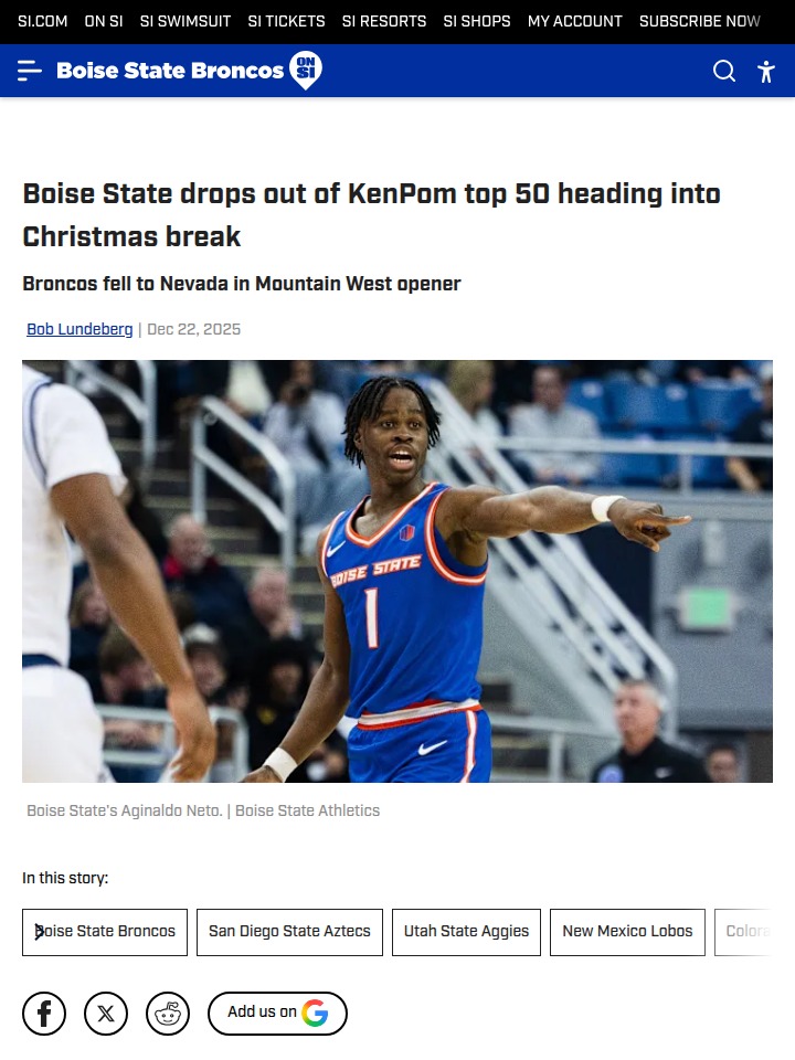 Susan Reeves+FollowBoise State hoops faces big test after KenPom dropBoise State basketball just slipped out of the KenPom top 50, landing at No. 52 after a tough loss to Nevada. That’s a shakeup for fans who’ve been tracking the Broncos’ rise this season. With a week off to regroup, all eyes are now on their Dec. 30 home game against New Mexico, the defending Mountain West champs. The Mountain West is looking stacked—Utah State leads at No. 29, and San Diego State is right ahead at No. 51. Can Boise State bounce back and make a statement? What’s your take on their chances in this loaded conference? #Sports #Basketball #BoiseState00Share