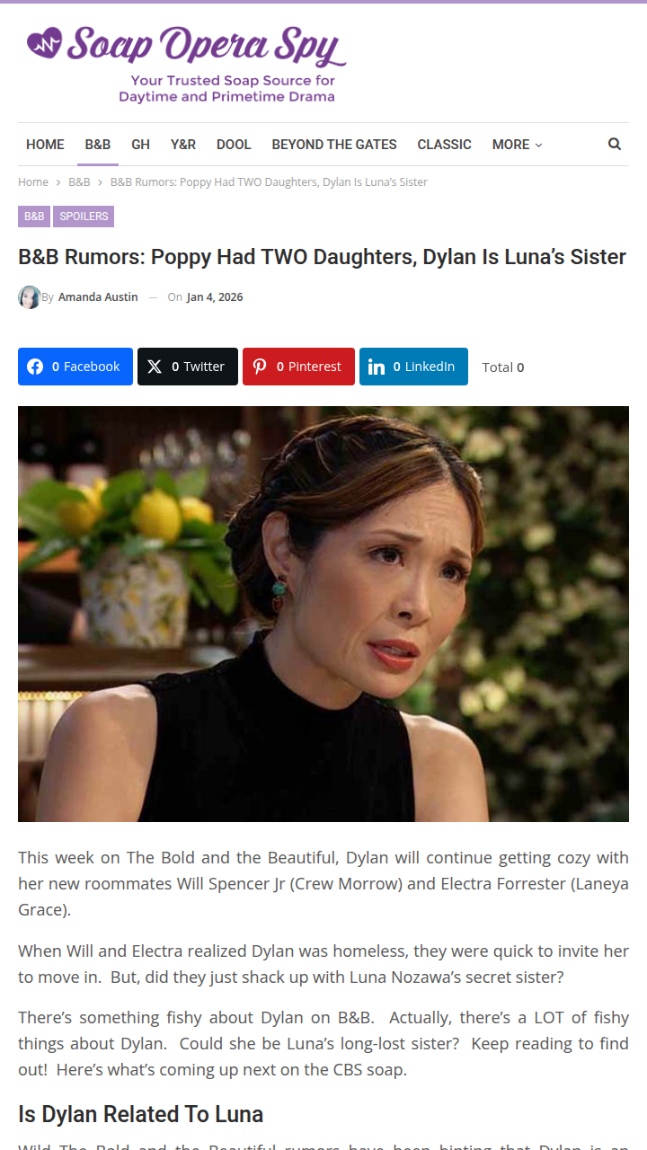 Tracy Johnson+FollowPoppy’s Secret Twins?! 🍼 B&B Fans SpeculatePoppy Nozawa might have more secrets than we thought! With Dylan moving in with Will and Electra, fans are buzzing that she could actually be Luna’s long-lost sister. The show’s been dropping hints about Dylan’s mysterious past and missing last name. Could Poppy have had twins and given one up? Or is Dylan just an impostor? This twist would totally shake up the B&B family tree! #Entertainment #Celebrity #BoldandBeautiful91Share