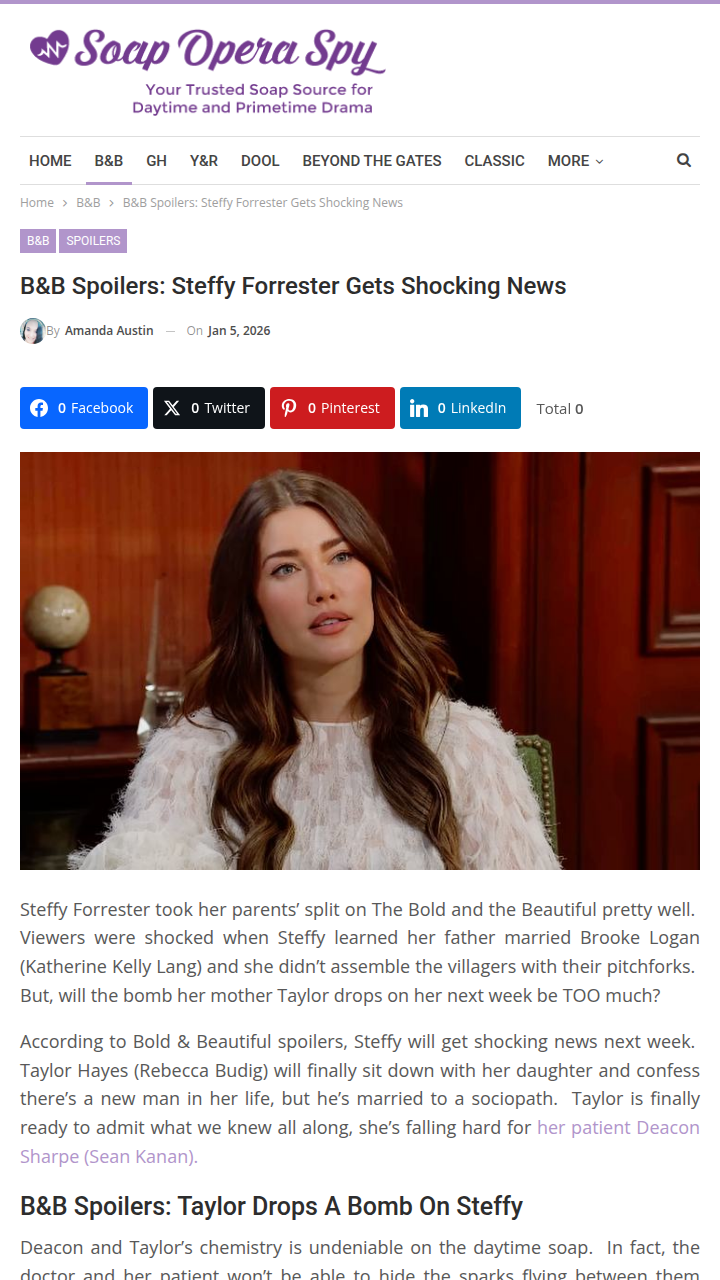 Chad Kemp+FollowTaylor’s Secret Crush on Deacon?! 😱Did anyone else catch that B&B spoiler about Taylor Hayes falling for Deacon Sharpe? I can’t believe she’s actually into her patient—who’s married to Sheila Carter, of all people! Steffy just survived Sheila’s drama, and now her mom wants to date Sheila’s husband? This is going to blow up fast. Is Taylor making a huge mistake, or could this be the twist we didn’t know we needed? #Entertainment #Celebrity #BoldandBeautiful20Share