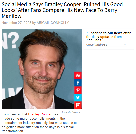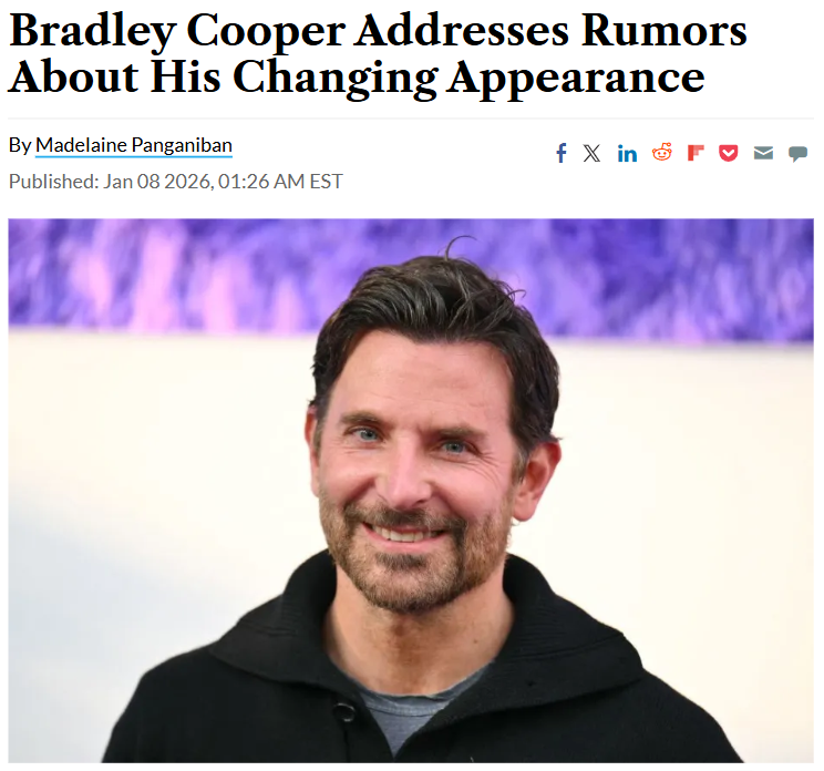 taylornoah+FollowBradley Cooper’s ‘Fakeman’ Glow-Up DramaBradley Cooper’s face is sparking wild plastic surgery rumors again, and the internet is not holding back. People are calling him ‘Fakeman’ (yep, a play on his A-Team character) and comparing his new look to everyone from Barry Manilow to Cillian Murphy. Even a plastic surgeon weighed in, saying the changes are subtle but definitely there. Oh, and he might be marrying Gigi Hadid soon—because why not add more buzz? #Beauty #BradleyCooper #PlasticSurgery00Share