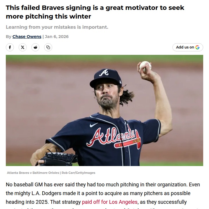 Timothy Huff MD+FollowWhy the Braves must stack up on pitchingWatching the Braves scramble for healthy arms last season was a wake-up call—just ask anyone who remembers the Cole Hamels saga. Signing him for $18 million only to get 3.1 innings in return proved how risky it is to rely on prospects or paper-thin depth. Even the Dodgers, with all their resources, never stop adding pitchers. With so many solid free agents still out there, now’s the time for Anthopoulos to make a move. What do you think: Should the Braves go all-in for another starter, or trust the young guns? #Sports #Baseball #Braves10Share