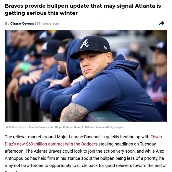 Maria Chavez+FollowBraves bullpen shakeup: Atlanta eyes big movesAtlanta’s front office looks ready to make a serious splash in the bullpen market this winter. With Joe Jimenez’s injury casting doubt on his reliability, and the reliever market heating up fast, it sounds like Alex Anthopoulos is shifting gears. The Braves might finally go after some top-tier late-inning arms—think Tyler Rogers or Pete Fairbanks—to boost their chances next season. Fans have mixed feelings about Anthopoulos’ usual cautious approach, but with the bullpen market moving quickly, waiting could mean missing out. What kind of reliever would you want to see in Atlanta? #Sports #Baseball #Braves10Share
