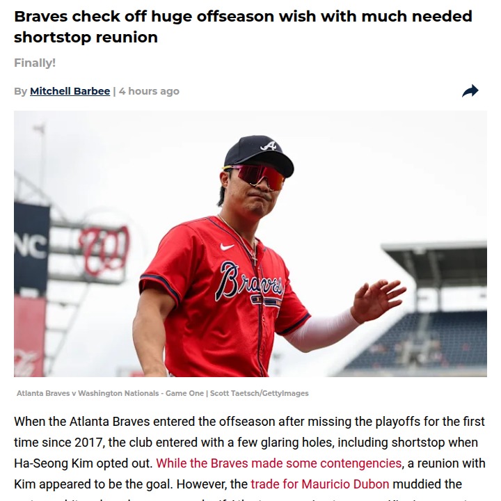 Kimberly Moore+FollowBraves reunite with Ha-Seong Kim for 2026Ha-Seong Kim is back in Atlanta! After a rollercoaster offseason and some uncertainty following the Dubon trade, the Braves have locked in their shortstop for 2026 with a one-year, $20 million deal. Kim’s return means Atlanta gets a solid defender and a motivated bat, all without a long-term commitment—smart move with CBA talks ahead. Fans, what do you think: Is this the piece the Braves needed to bounce back, or do you still see gaps in the roster? Let’s talk about how this shapes the team’s future! #Sports #Baseball #Braves20Share