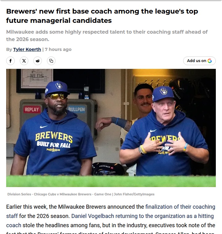 Catherine Reeves+FollowWhy Spencer Allen could be the Brewers’ next big moveSpencer Allen just stepped into the Brewers’ first base coach role, but insiders across MLB are already buzzing about his future. Allen’s knack for teaching fundamentals and his deep college coaching roots make him a hot commodity—other teams even tried to poach him before this promotion! With the Brewers skipping a bench coach this season and Pat Murphy’s contract up soon, Allen could be next in line to lead. It’s a bold bet on player development and smart coaching. What do you think—should Milwaukee lock him in as their future manager before another team swoops in? #Sports #Baseball #Brewers00Share
