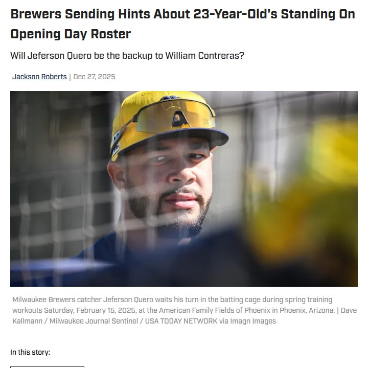 Maria Chavez+FollowIs Jeferson Quero the Brewers’ next breakout?The Brewers are dropping some real hints that Jeferson Quero could finally break into the Opening Day roster this season. After battling through tough injuries, Quero’s future with Milwaukee is at a crossroads—especially with the team cycling through veteran backups behind Contreras. His defense and ability to handle big-league pitchers in spring training will be under the microscope. If he steps up, he could be the fresh energy the Brewers need behind the plate. What do you think—should the Brewers give Quero the nod, or stick with a proven vet? Let’s hear your take! #Sports #Baseball #Brewers01Share