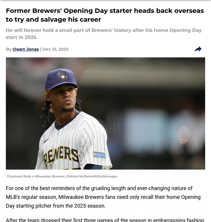 Timothy Huff MD+FollowBrewers’ 2025 Opening Day starter heads to KoreaElvin Rodríguez, who kicked off the Brewers’ historic 2025 season as their home Opening Day starter, is taking his talents back overseas—this time to Korea’s Lotte Giants. After a rollercoaster year bouncing between MLB teams and the minors, Rodríguez is hoping to recapture the magic he found in Japan, where he posted a sub-2.00 ERA. It’s a rare journey: few players return to MLB after two stints in Asia. Do you think we’ll see Rodríguez back in the big leagues, or is this the start of a new chapter? #Sports #Baseball #Brewers10Share