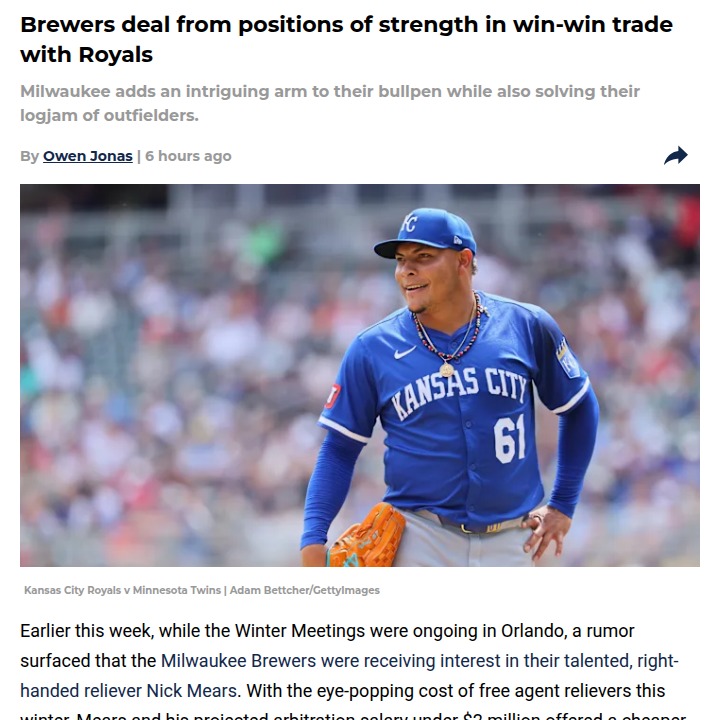 Catherine Reeves+FollowBrewers shake up: Who’s next to be traded?Milwaukee’s front office is keeping fans on their toes this offseason. After the surprise trade of Isaac Collins and Nick Mears to the Royals, the Brewers are far from done. With a crowded bullpen and outfield, all eyes are now on closer Trevor Megill and first baseman/outfielder Tyler Black as the next likely trade chips. Megill’s value is sky-high after a stellar season, while Black’s blocked path to playing time makes him a prime candidate to move. What do you think—should the Brewers keep dealing, or is it time to settle the roster? #Sports #Baseball #Brewers00Share