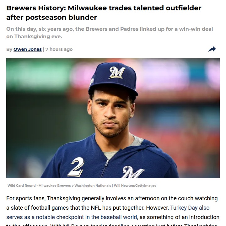 Catherine Reeves+FollowMilwaukee’s wild Thanksgiving trade still echoesSix years ago, the Brewers made a gutsy Thanksgiving-eve move, trading rookie outfielder Trent Grisham after his infamous postseason error. That one play haunted Milwaukee fans, but the trade with San Diego ended up benefiting both teams in unexpected ways. Grisham found new life in San Diego and later New York, while the Brewers got solid seasons from Luis Urías and Eric Lauer. It’s a reminder of how one moment can change careers—and how the right trade can help everyone move forward. What do you think: did the Brewers make the right call? #Sports #Baseball #Brewers00Share