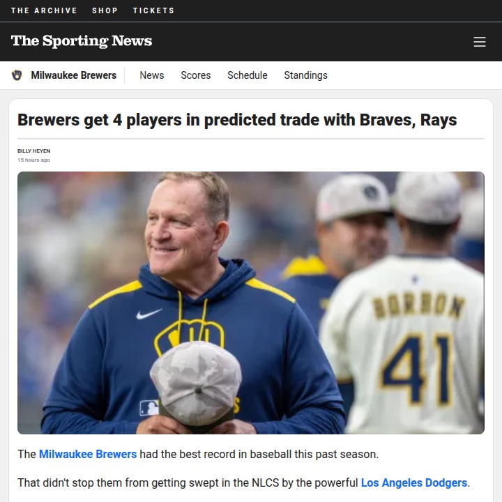 Andrea Castillo+FollowBrewers eye bold moves for a power boostMilwaukee fans, imagine seeing Brandon Lowe and Yandy Díaz in Brewers uniforms next season. A proposed three-team trade with the Braves and Rays could bring these power bats to Milwaukee, plus two promising prospects, in exchange for Freddy Peralta and Joey Ortiz. With Woodruff returning to the rotation, the Brewers could finally get the offensive firepower they’ve been missing in October. It’s a gutsy move—trading a top pitcher for more pop at the plate. Would you make this deal to push the Brewers over the postseason hump? Let’s hear your take! #Sports #Baseball #Brewers00Share