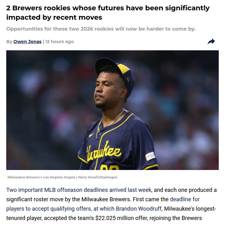 Andrea Castillo+FollowBrewers’ roster shakeup changes rookie futuresMilwaukee’s latest roster moves are shaking up the future for two of their most promising rookies. With Brandon Woodruff returning and Jake Bauers locked in for another year, Tyler Black and Carlos Rodríguez suddenly face tougher paths to big league playing time in 2026. Black, once a top prospect, might find himself back in Triple-A despite being ready to hit at the next level. Rodríguez, a two-time Minor League Pitcher of the Year, could again be used as rotation depth instead of getting a full shot. How do you feel about Milwaukee’s approach—should they make more room for young talent or stick with proven vets? #Sports #Baseball #Brewers00Share