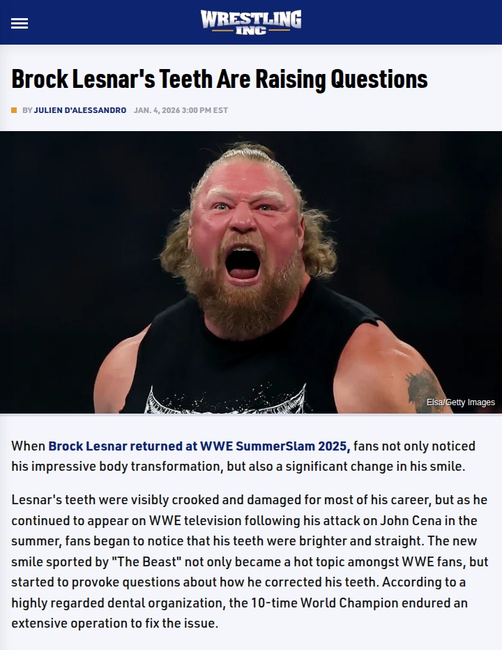 reneewang+FollowBrock Lesnar’s New Smile: Beast Mode Upgrade?Anyone else notice The Beast’s jaw-dropping new look at SummerSlam? Brock Lesnar’s teeth have always been a bit of a talking point, but after his return and that wild attack on Cena, fans can’t stop buzzing about his Hollywood-worthy smile. Turns out, Lesnar went through some serious dental work—veneers, implants, the works—to fix years of damage from bruxism and maybe even tobacco use. Do you think this new Lesnar adds to his intimidation factor, or does it take away some of that raw edge? #Sports #Wrestling #BrockLesnar50Share