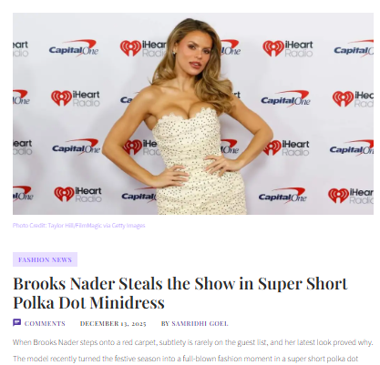 taylornoah+FollowBrooks Nader’s Minidress MomentBrooks Nader just redefined festive glam at the Z100 Jingle Ball! She rocked a super short, strapless polka dot minidress that basically stole the whole red carpet. The look? All about bold prints, sheer tights, and major confidence—no extra accessories needed. Off the carpet, she’s giving us serious house envy with her new, ultra-modern LA pad. Brooks is clearly living her best life and serving inspo both on and off the runway! #Beauty #BrooksNader #JingleBall60Share