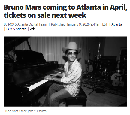 hwatkins+FollowBruno Mars brings The Romantic Tour to AtlantaBruno Mars is set to light up Atlanta with his first full stadium tour in nearly a decade! On April 25, 2026, Bobby Dodd Stadium at Hyundai Field will host the global superstar, just weeks after his new album drops. Fans can also catch Anderson .Paak as DJ Pee .Wee on stage. Tickets go on sale January 15, but those who sign up early at BrunoMars.com get a presale shot on January 14. This is shaping up to be one of Atlanta’s biggest music events—who’s planning to go, and what song are you hoping to hear live? #Entertainment #BrunoMars #AtlantaConcert10Share