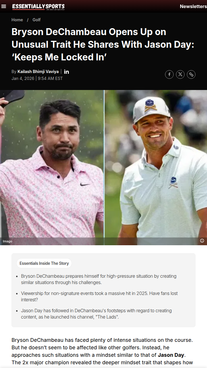 frank59+FollowBryson & J-Day: Masters of Pressure?Bryson “The Scientist” DeChambeau just revealed he shares a rare mental edge with Jason Day—both thrive by putting themselves in high-pressure situations, even off the course. Bryson says his wild YouTube challenges keep him “locked in” for big moments, while J-Day trains his mind to get comfy being uncomfortable (think Augusta National nerves). With PGA Tour viewership down, both stars are also leading the charge to connect with fans through YouTube. Is this the new blueprint for golf greatness? #Sports #Golf #BrysonDeChambeau00Share