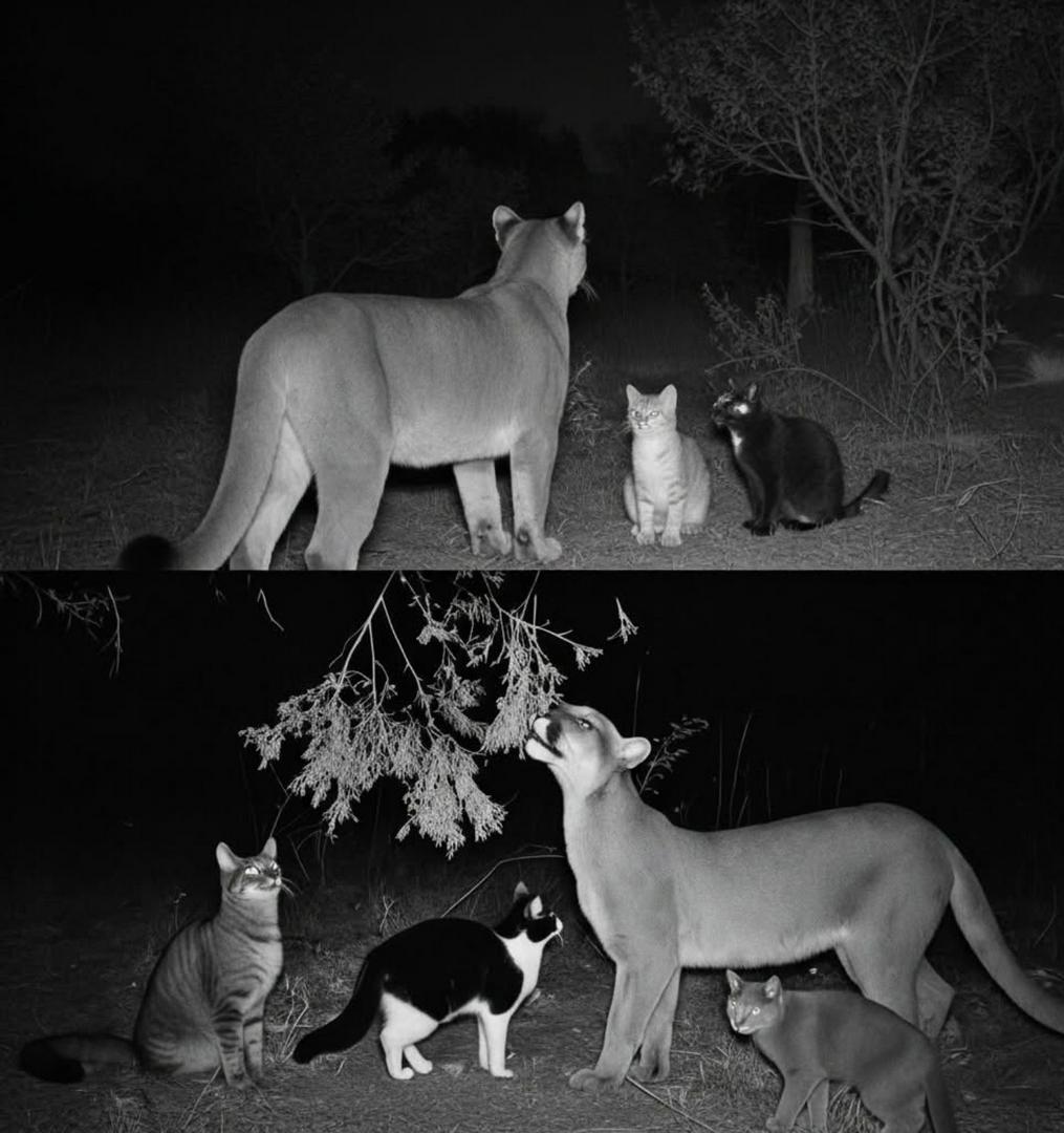 In a small mountain town, worry began to spread when cats started disappearing — first one, then another, and by the end of the week, a third was gone. Around here, cats didn’t just vanish. They were either beloved house pets kept safely indoors, or outdoor cats who had grown up alongside the wilderness — careful, seasoned, and always aware of danger. Trail cameras were set up deep in the woods. What they captured stunned everyone: a mountain lion wasn’t hunting the cats — he was traveling with them. Almost as if he were forming his own pride. The story was later confirmed that when this lion was just a cub, he had been found abandoned. A colony of stray cats had taken him in — grooming him, playing beside him, and caring for him as one of their own. When he grew older, he returned to the wild… but never forgot his first family. Villagers often spotted him at sunrise resting on a rocky ledge surrounded by his cat companions, a peaceful scene that showed their lasting friendship. This rare story reminds us that family is not always about blood but about love, care, and the simple act of belonging. As one owner put it, smiling, “She’s living her dream — being a big cat. And that makes me happy.” #animals #wildlife #WildlifeConservation #cats #lions #lioncub #kindnessmatters #storytime #wholesome #wildlifestories