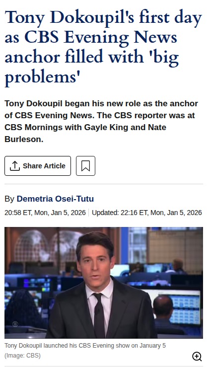 Cathy Porter+FollowCBS News Debut Chaos 😬Tony Dokoupil’s first night as CBS Evening News anchor was a total mess—viewers caught multiple technical flubs, awkward transitions, and Tony visibly frustrated on-air. The real drama? Fans are blaming new CBS News boss Bari Weiss and the recent Paramount Skydance merger for the chaos, sparking a heated debate: Is the network falling apart or just adjusting to big changes? #Entertainment #TVSeries #CBSEveningNews118Share