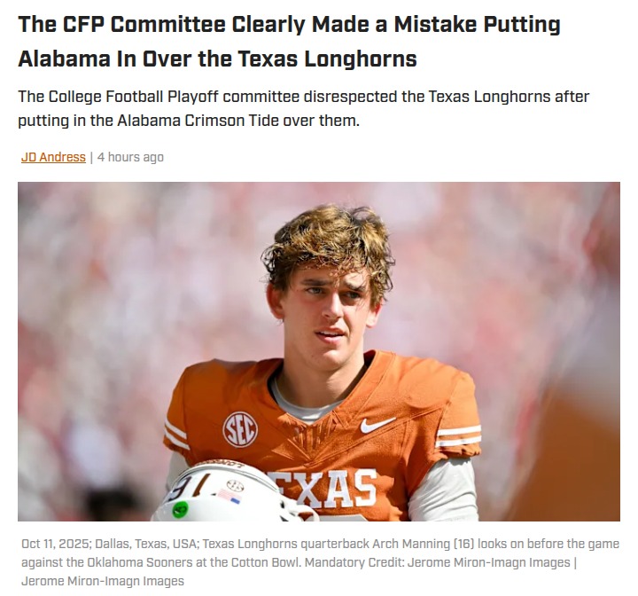 Chad Williams+FollowDid the CFP Snub the Longhorns for Bama?Longhorn Nation, how are we feeling after the CFP committee picked the Crimson Tide over Texas? Looking at the resumes, the Horns had three top-10 wins and a dominant Red River Rivalry performance, while Bama dropped their opener to the Noles. Sark’s squad had every reason to expect a playoff spot, but the committee’s logic seems shaky at best. Did Texas get robbed, or did Bama deserve the nod? Let’s hear your takes! #Sports #Football #CFP00Share