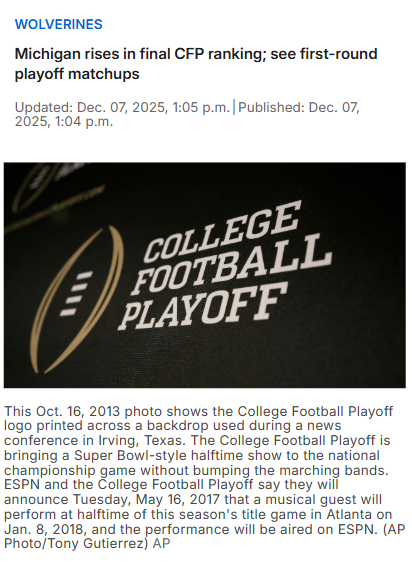 Jeffrey Armstrong+FollowMichigan’s playoff hopes dashed, but surprises shake up CFPMichigan fans, it’s official: the Wolverines finished at No. 18 in the final College Football Playoff rankings, just outside the new 12-team field. The real shocker? Indiana soared to No. 1 after toppling Ohio State in the Big Ten championship, making history with their first-ever top spot. Meanwhile, Tulane and James Madison both snagged automatic playoff bids, shaking up the usual power balance. The first-round matchups are set, and some big names—like Notre Dame—are left out. How do you feel about the new playoff format and these unexpected rankings? #Sports #Football #CFP00Share