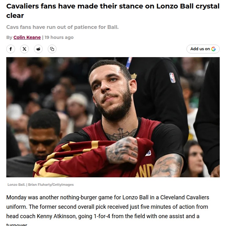 Amy Tanner+FollowCavs fans losing patience with Lonzo BallEvery time Lonzo Ball touched the ball at Rocket Mortgage FieldHouse, you could feel the tension—Cavs fans are clearly fed up. After just five minutes on the court and another rough shooting night, the groans from the crowd said it all. It’s tough to watch, especially knowing Lonzo’s battled back from serious injuries. But in a city hungry for wins, patience is running thin. With Craig Porter Jr. and Tyrese Proctor now ahead in the rotation, is this the end of Lonzo’s run in Cleveland? How do you feel about the way fans are reacting? #Sports #Basketball #Cavs00Share