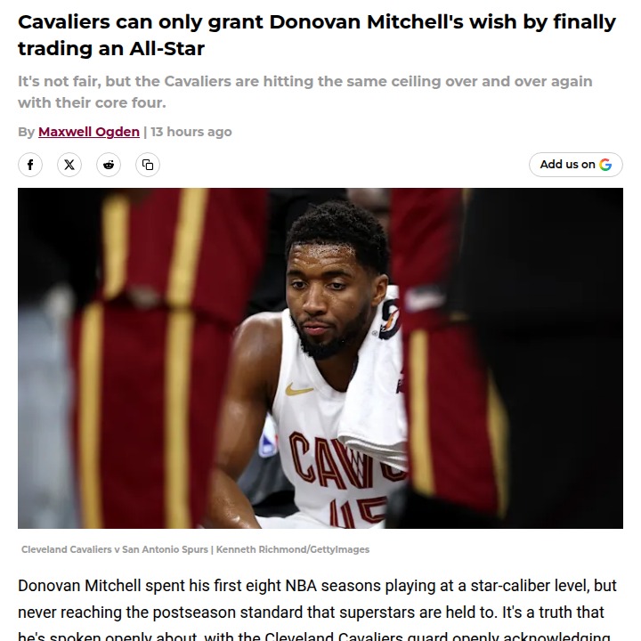 Nicole Obrien+FollowCavs face tough call to unlock Mitchell’s dreamDonovan Mitchell’s push for the Conference Finals is at a crossroads. Despite the Cavaliers’ impressive regular season records, their All-Star-packed core just can’t get over the playoff hump. The reality? To finally help Mitchell reach that next level, Cleveland may have to break up its talented roster and trade one of its stars. With Mobley’s defensive dominance and Mitchell locked in as the franchise face, the big question is: should Allen or Garland be the one to go? How would you feel about the Cavs making a major move to chase a real shot at the Finals? #Sports #Basketball #Cavs00Share
